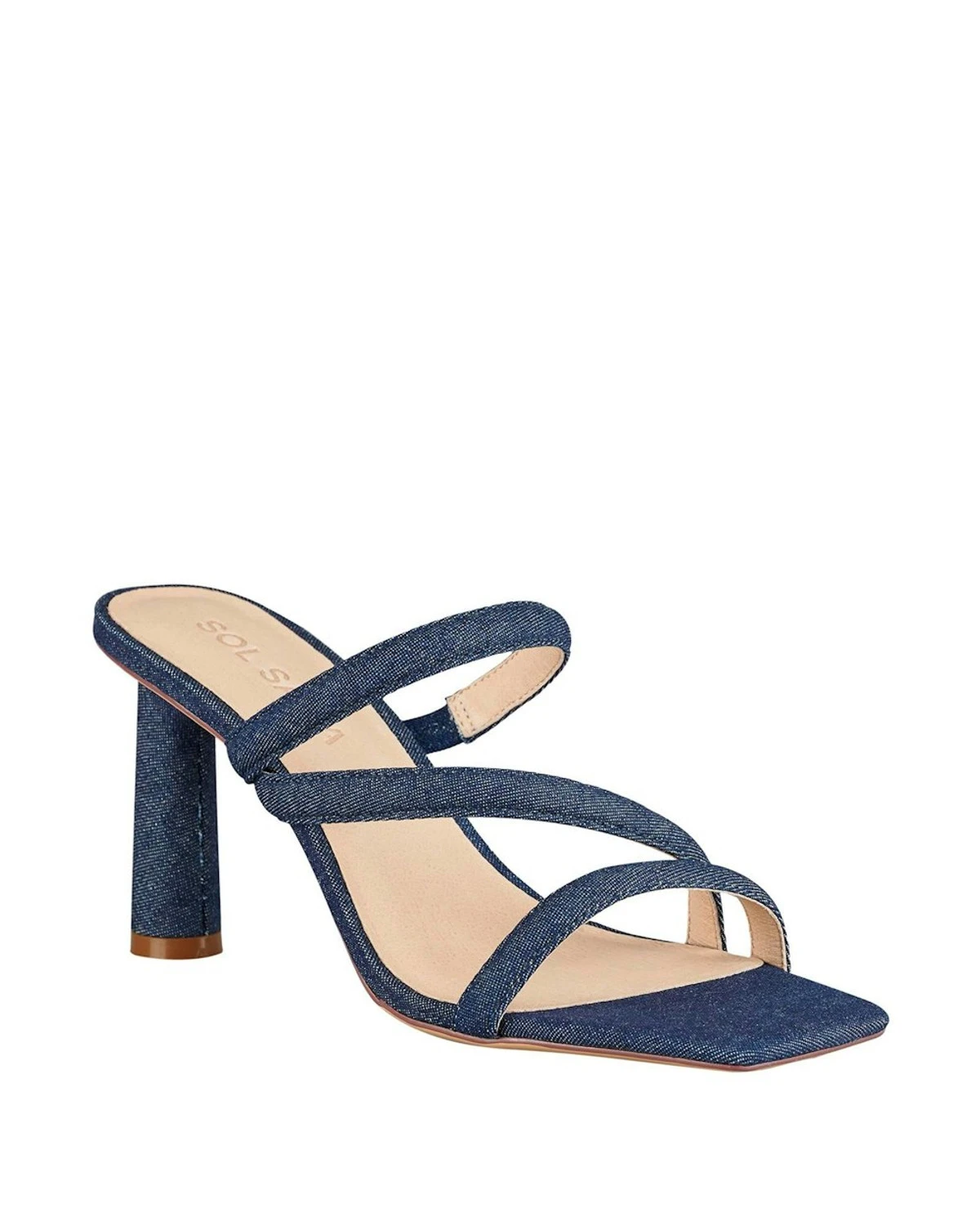 Sol Sana’s Brendon heel introduces a sophisticated twist to the classic stiletto silhouette. Luxuriously crafted from this seasons newest addition, denim. Statement straps elegantly envelop the front of the foot, ensuring a secure and stylish slide-on experience.