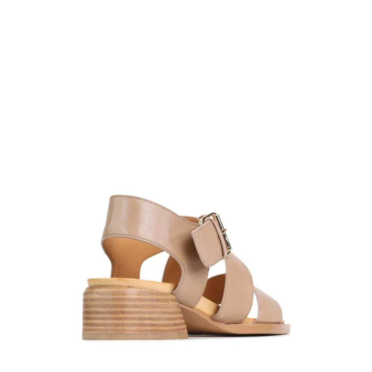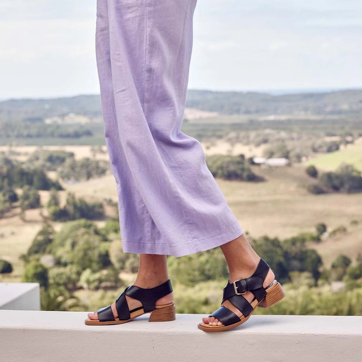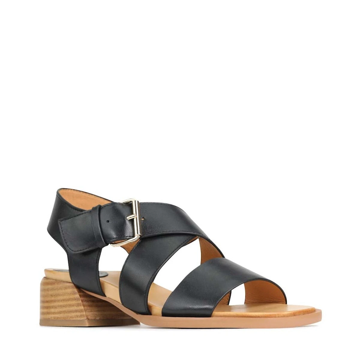 Elevate your wardrobe with the ELLI leather ankle strap sandals. Featuring a criss cross strap, adjustable large metal buckle, and a 45mm stacked leather heel, these sandals are the perfect combination of sophistication and practicality. Hand-crafted with luxurious leather and a leather-wrapped footbed, these sandals will instantly elevate any ensemble.