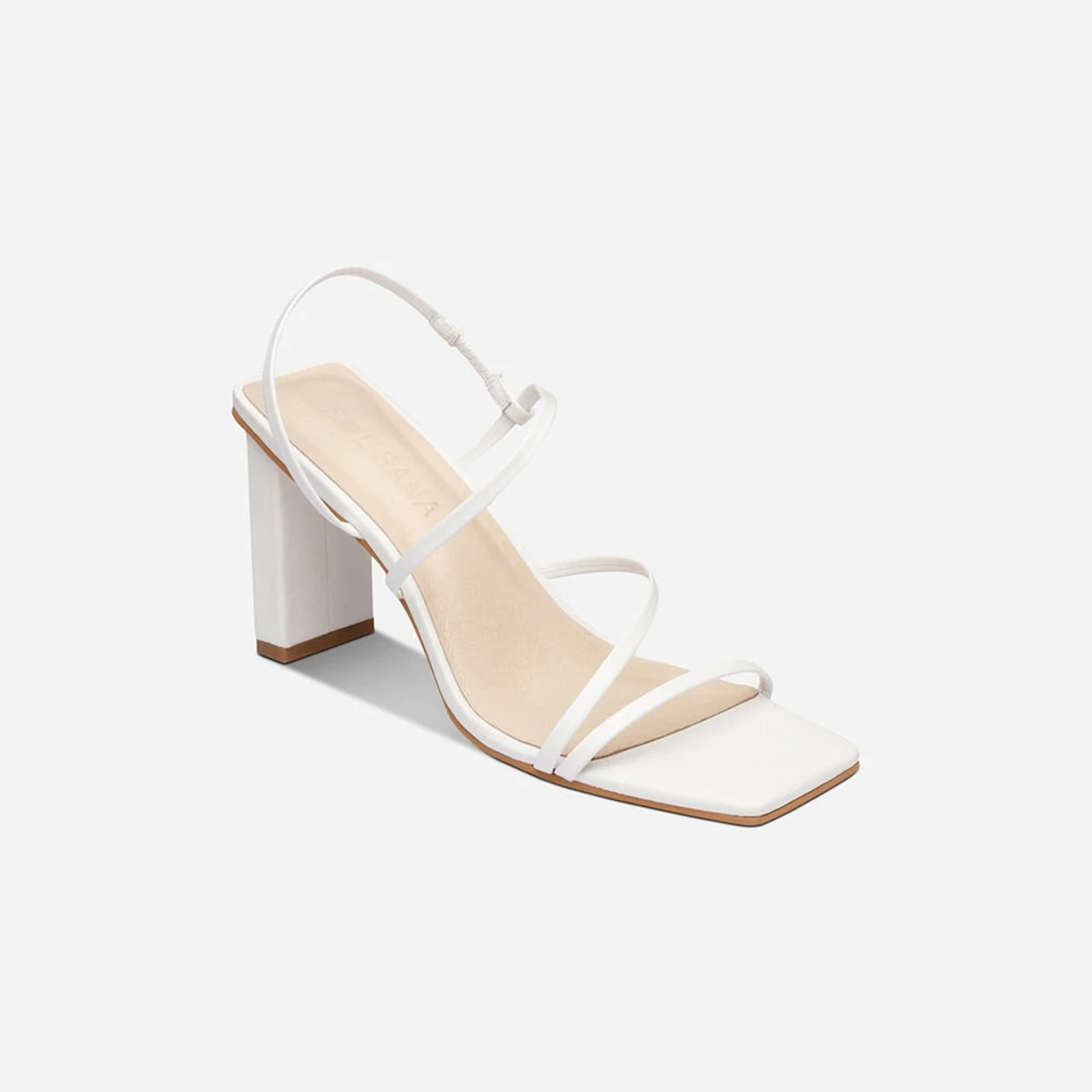 A square toe and angular modern 8cm heel brings a contemporary edge to this otherwise minimalist heel. Delicate leather straps wrap the foot in an asymmetric fashion before extending back around the heel.