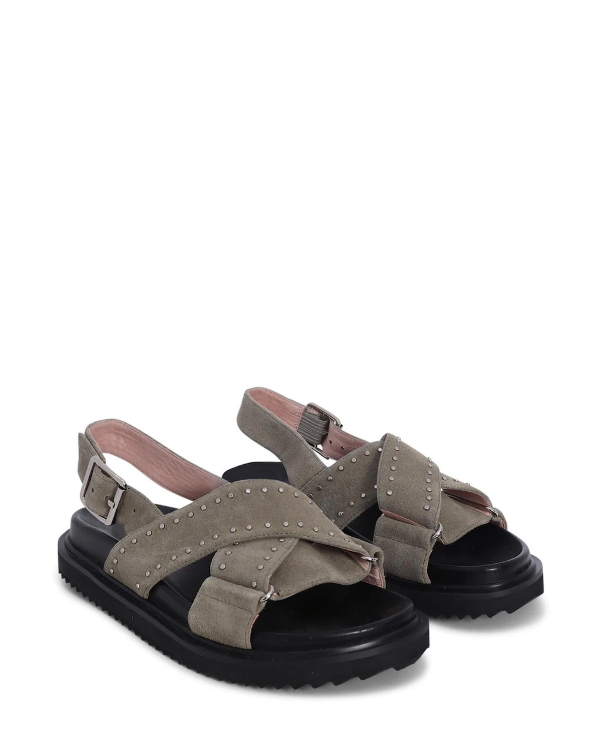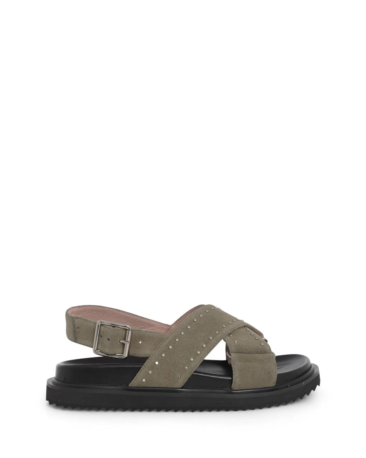 Available in Tan/Gold stud, Black/Gold stud, Moss suede/Silver stud.