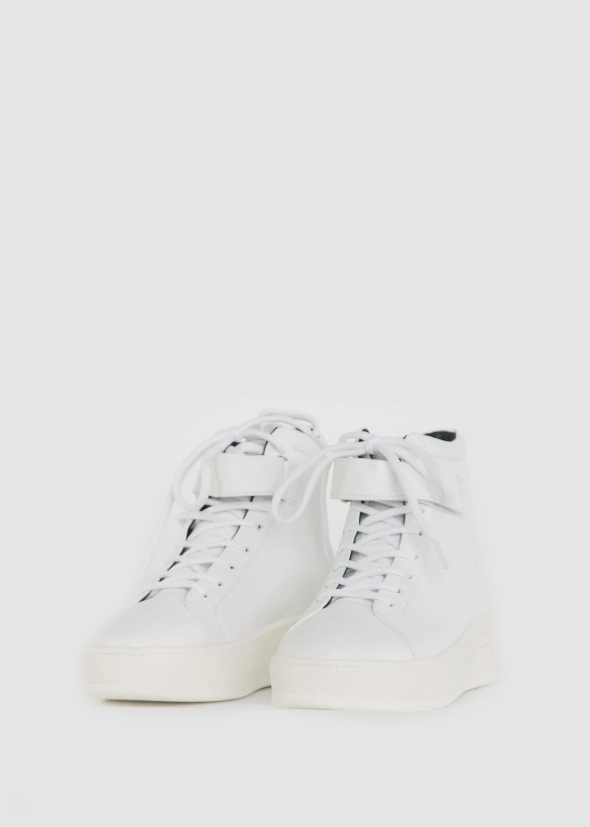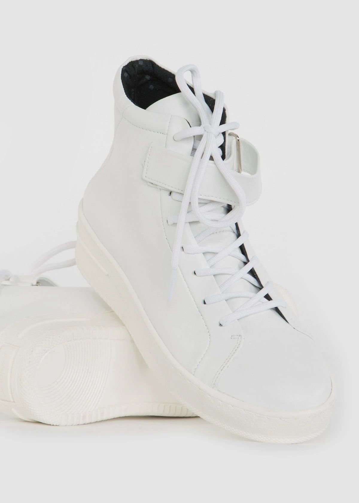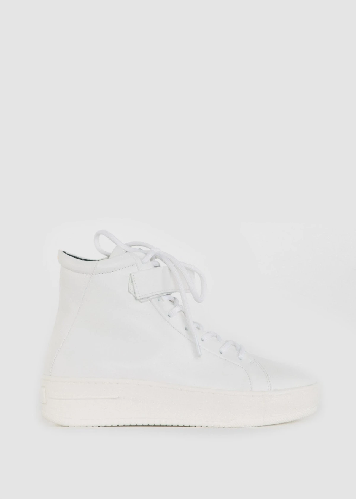 The Seven20 High Cut Strap Shoe in White from Royal Republiq is a Women’s mid-ankle sneaker made from Viagretta leather. As well as round sport laces, it features a single velcro ankle strap and a slightly rounded, flatform sole.